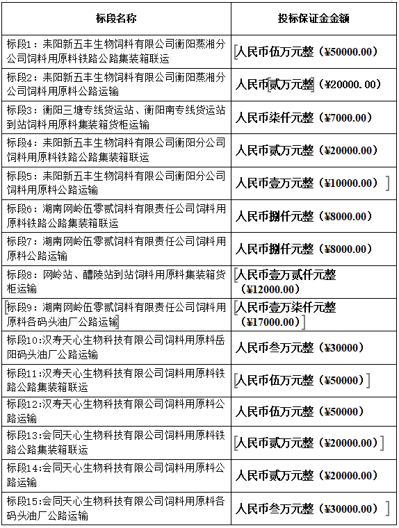 项目概况:湖南新五丰股份有限公司所需饲料用原料以散装、包装或集装箱装运的形式,从深圳、广东、湖南各港口、码头或货运专线以公路运输或铁路公路联运的方式运至耒阳新五丰生物饲料有限公司衡阳蒸湘分公司、耒阳新五丰生物饲料有限公司衡阳分公司及湖南网岭伍零贰饲料有限责任公司、汉寿天心生物科技有限公司、会同天心生物科技有限公司。