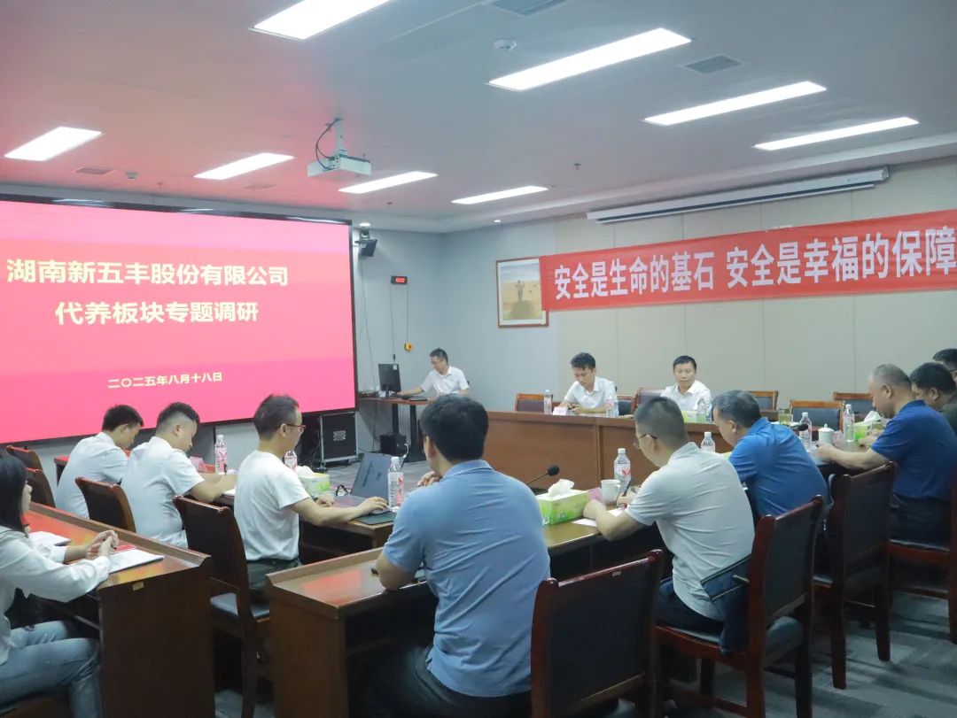8月18日,湖南农业集团党委副书记、副董事长、总经理杨正华到湖南新五丰股份有限公司(以下简称“新五丰”)代养事业部调研指导并召开座谈会,新五丰党委书记、董事长万其见,党委委员、养殖事业部总经理唐威,总法律顾问、代养事业部总经理李锦林参加。