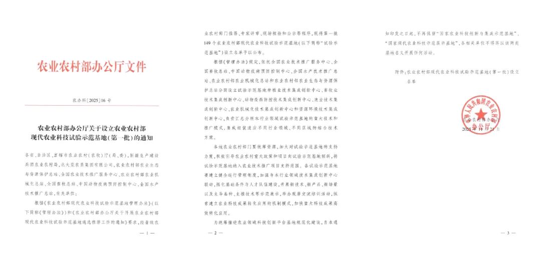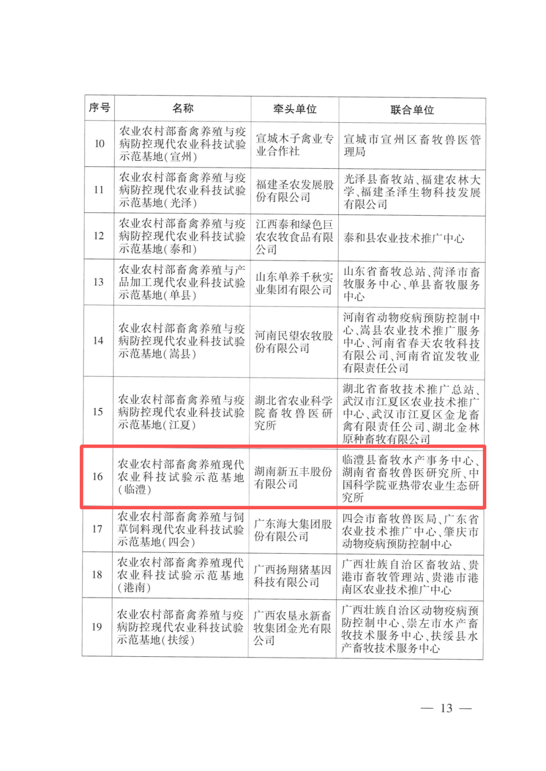 近日,农业农村部公布了第一批149个现代农业科技试验示范基地(以下简称“试验示范基地”)设立名单。经农业农村部门推荐、专家评审、现场核验和公示等程序,由湖南 新五丰 股份有限公司牵头、联合 临澧县畜牧水产事务中心 、 湖南省畜牧兽医研究所 、 中国科学院亚热带农业生态研究所 共同申报的“农业农村部畜禽养殖现代农业科技试验示范基地(临澧)”成功入选,系湖南省畜禽领域唯一一家获评单位。