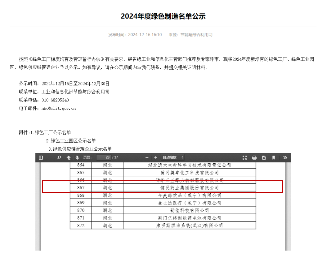近日,工业和信息化部公布了《2024年度绿色制造名单》,健民集团荣膺国家级“绿色工厂”称号,树立了医药行业绿色转型的标杆典范。