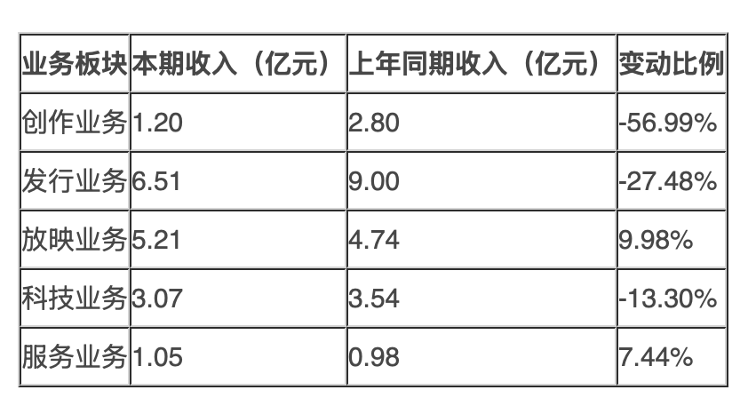 《每日经济新闻》记者梳理发现,在公司五大业务板块中,上半年放映业务与服务业务实现同比增长,成为业绩中的“稳定器”;但创作业务与发行业务表现不佳,收入分别同比下降56.99%和27.48%,成为拖累整体营收的主要因素。