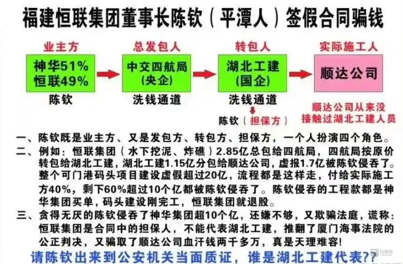 其资本版图较为神秘,但疑似由于合作方纠纷,福建顺达航道疏浚工程法定代表人冯珠茂已连续5年实名举报恒联集团董事长陈钦。近期9月12日,新浪网友“@控告福建陈钦骗国资”再度发微博,向中央第四巡视组公开举报福建省高级人民法院陈国雄、林欣宇两法官,“以法之名”为福建恒联集团老板陈钦非法谋利3000万。此前,其持续指控陈钦通过恒联集团虚构工程款套现超10亿。