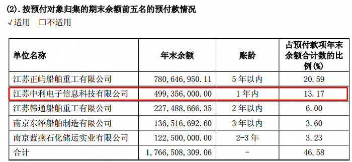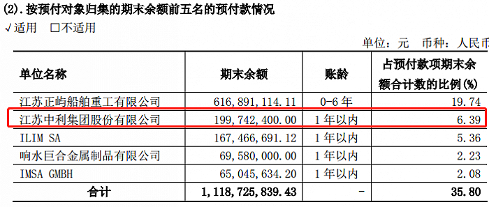 另据其2020年年度报告,中利集团以约2亿元的期末余额在汇鸿集团预付款对象名单中排名第二位,占当期预付款期末余额合计数的6.39%。