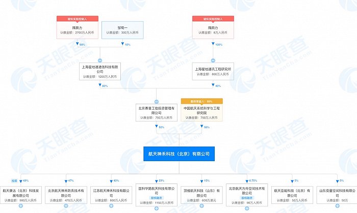 天眼查显示,航天神禾由中国航天系统科学与工程研究院与北京赛普工信投资管理有限公司(简称“北京赛普”)各持股50%,其中隋田力通过旗下上海星地通通信科技有限公司和上海星地通讯工程研究所全资控股北京赛普。