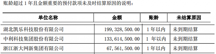 汇鸿集团2016年半年度报告显示,账龄超过1年且金额重要的预付款项未及时结算的公司名单中,ST凯乐、中利集团、浙大网新集团在列,金额分别为1.99亿元、1.34亿元、6756.15万元,账龄均为1年以内,未结算原因均为“未到期结算”。其中凯乐科技还是当时汇鸿集团报告期内预付款项中第5名。