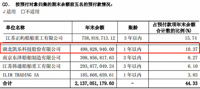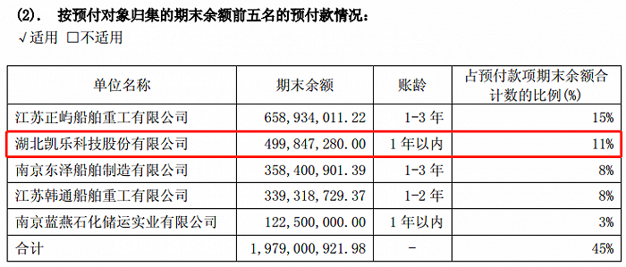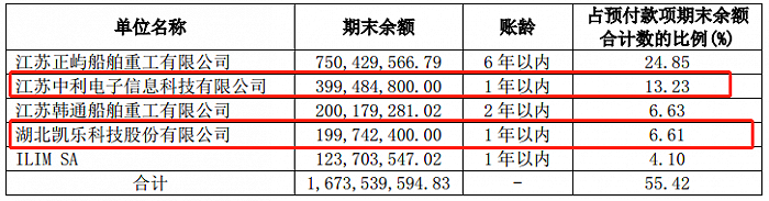 汇鸿集团2019年年度报告显示,在当年按预付对象归集的期末余额前五名的预付款情况明细表中,中利集团、ST凯乐均出现,涉及期末余额分别是4亿元、2亿元,账龄均为1年以内,分别占该公司当年预付款项期末余额合计数的13.23%、6.61%。