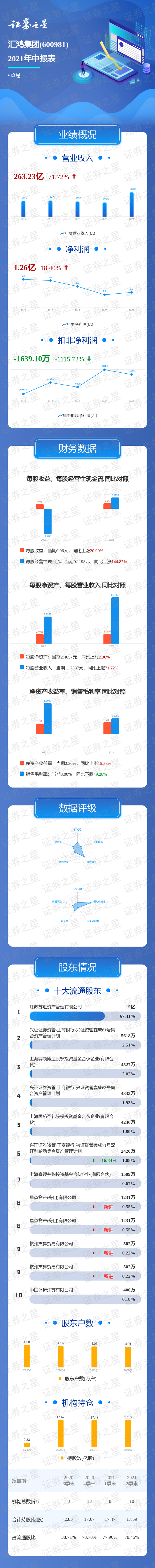 汇鸿集团2021中报显示,公司主营收入263.23亿元,同比上升71.72%;归母净利润1.26亿元,同比上升18.4%;扣非净利润-1639.1万元,同比下降1115.72%;负债率74.48%,投资收益1.23亿元,财务费用1.18亿元,毛利率3.0%。