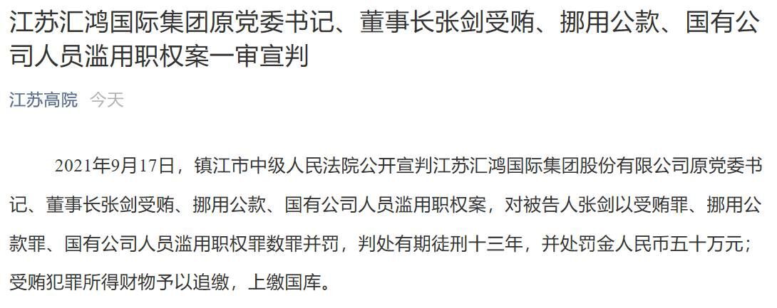 9月17日,江苏省高级人民法院官方微信号“江苏高院”发布消息称,今日,镇江市中级人民法院公开宣判汇鸿集团(600981,SH)原党委书记、董事长张剑受贿、挪用公款、国有公司人员滥用职权案,对被告人张剑以受贿罪、挪用公款罪、国有公司人员滥用职权罪数罪并罚,判处有期徒刑十三年,并处罚金人民币五十万元;受贿犯罪所得财物予以追缴,上缴国库。