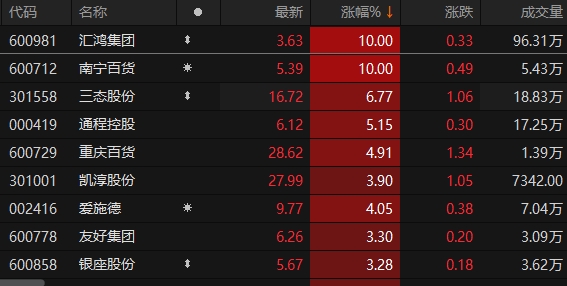 A股商贸零售板块表现活跃 汇鸿集团、南宁百货涨停