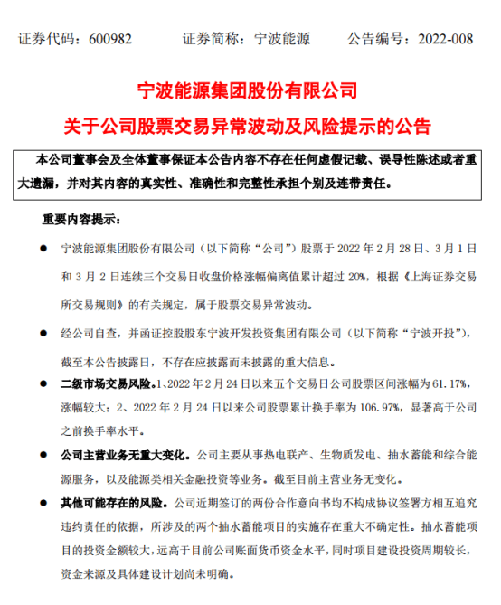 对于上述两个抽水蓄能电站项目,宁波能源3月1日晚间也给出了风险提示:海曙龙观抽水蓄能电站项目截至3月1日公告披露,合作意向书涉及的项目未有实质性进展,项目的实施仍存在重大不确定性;而宁波奉化抽水蓄能电站项目,该合作意向书仅为三方经友好协商达成的意向性协议,不构成协议双方相互追究违约责任的依据,所涉及项目的实施存在重大不确定性。