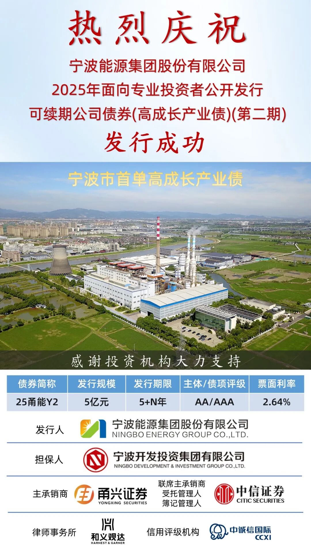 9月19日,宁波市首单“高成长产业债”——宁波能源集团股份有限公司2025年面向专业投资者公开发行可续期公司债券(高成长产业债)(第二期)在上海证券交易所成功发行。