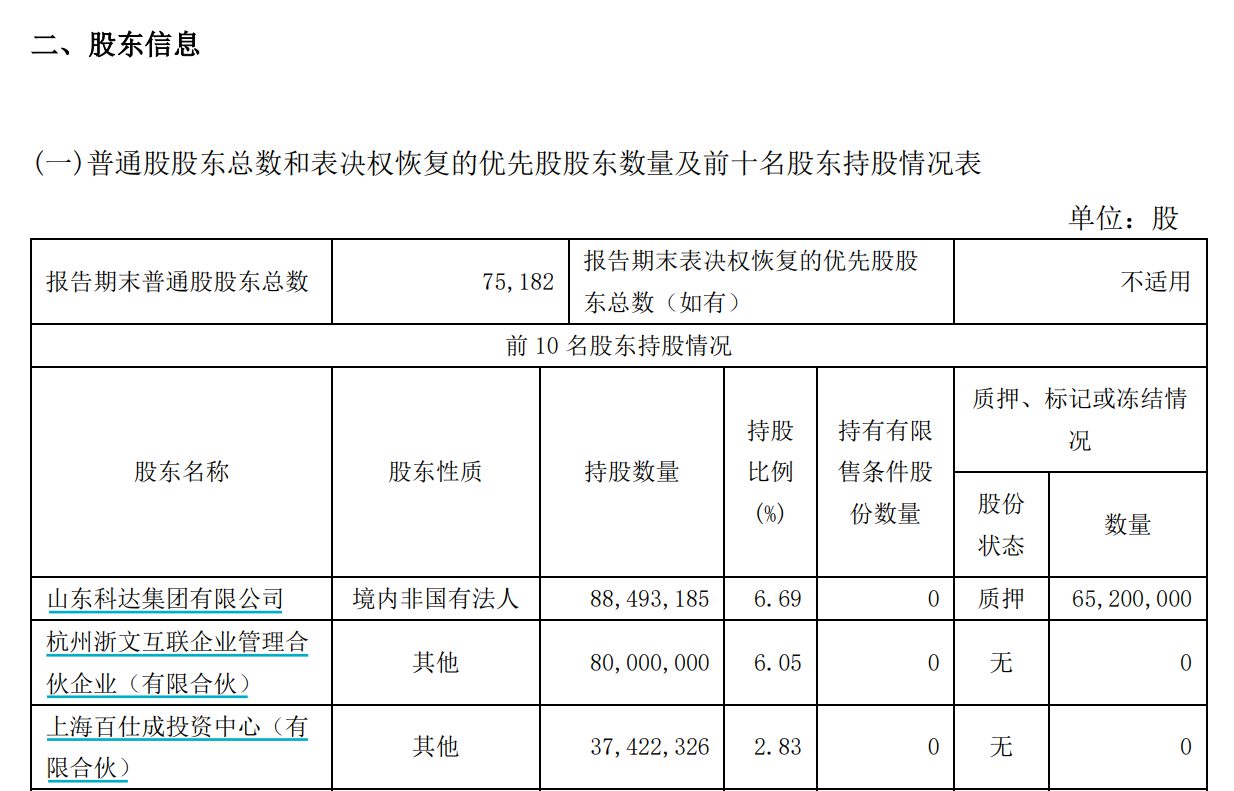 据2022年三季度财报,山东科达持有浙文互联6.69%股份,为公司第一大股东。