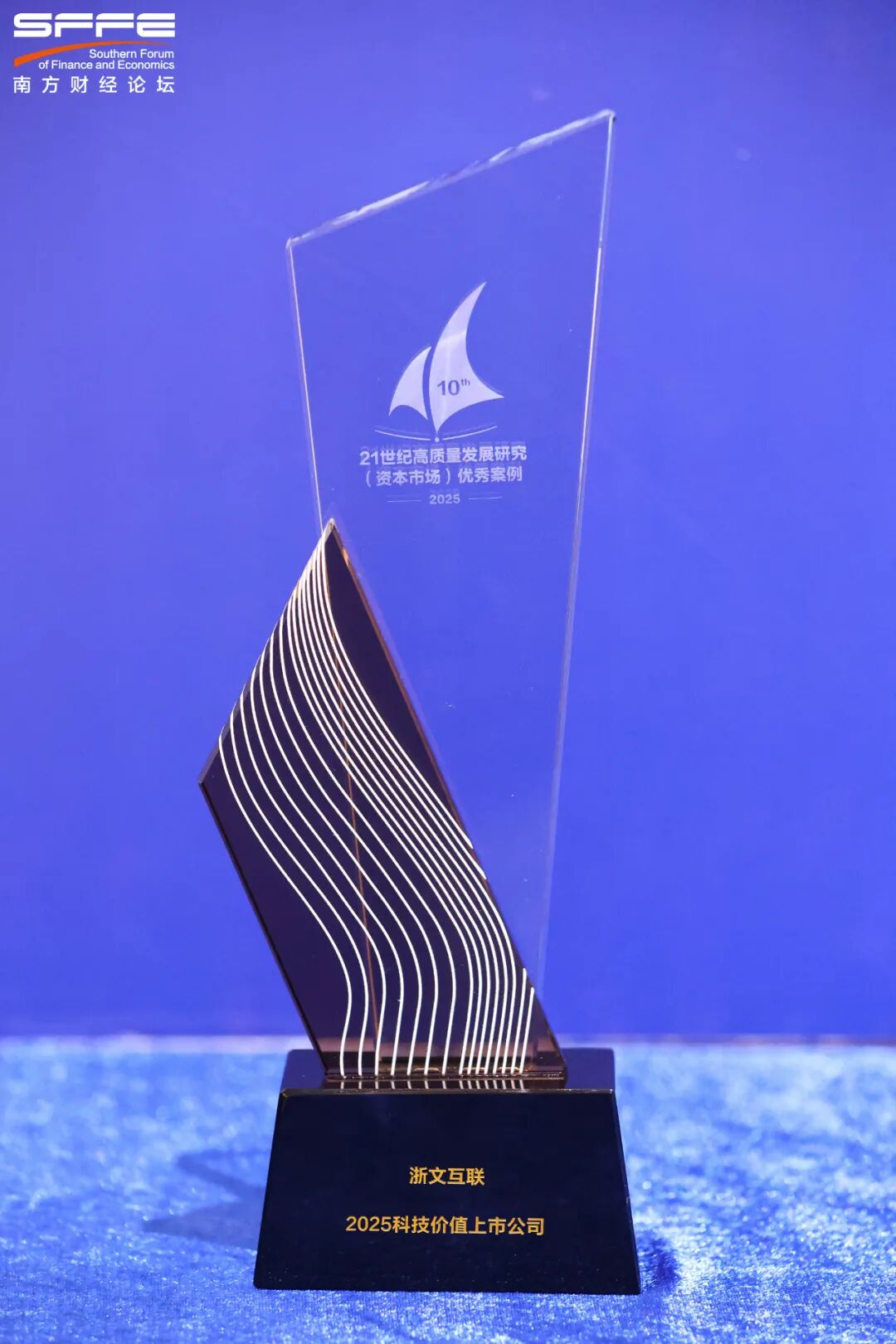 12月5日至6日,由南方财经全媒体集团主办、21世纪经济报道承办的南方财经论坛2025年会在广州召开。论坛期间揭晓了“21世纪高质量发展研究(资本市场)优秀案例”, 浙文互联 凭借出色的公司治理与科技创新成果,成功入选“2025年度科技价值上市公司”。