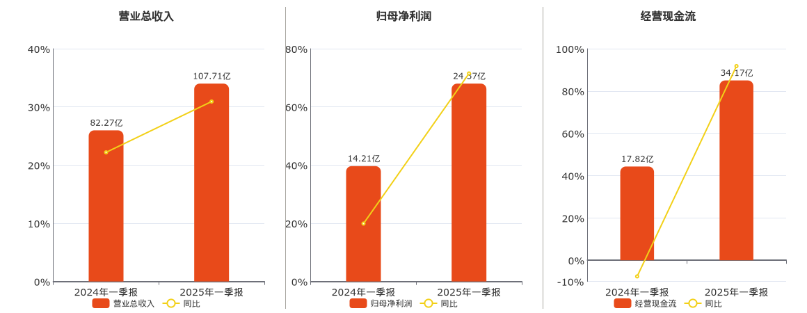 公司营业总收入为107.71亿元。归母净利润为24.37亿元。经营活动现金净流入为34.17亿元。