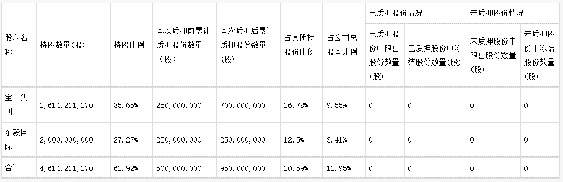 宝丰集团及其一致行动人东毅国际累计质押宝丰能源股份9.5亿股,占其所持股份比例的20.59%,占公司总股本比例的12.95%。