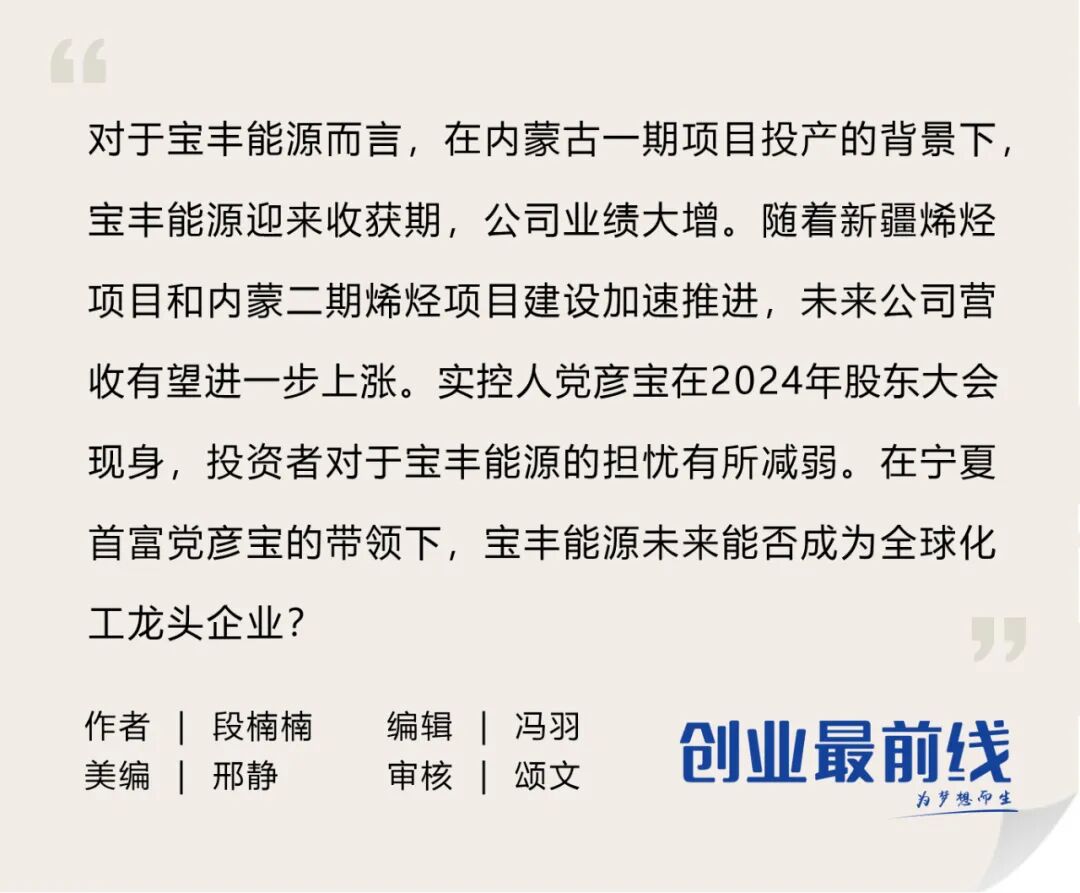 随着实控人党彦宝在2024年股东大会现身,投资者对于宝丰能源的担忧有所减弱。在宁夏首富党彦宝的带领下,宝丰能源未来能否成为全球化工龙头企业,「创业最前线」将持续保持关注。