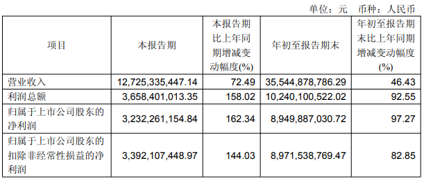 宝丰能源(600989.SH)近日披露的2025年第三季度报告显示,前三季度,公司营业收入为355.45亿元,同比增长46.43%;归属于上市公司股东的净利润89.50亿元,同比增长97.27%;归属于上市公司股东的扣除非经常性损益的净利润89.72亿元,同比增长82.85%;经营活动产生的现金流量净额135.82亿元,同比增长135.00%。