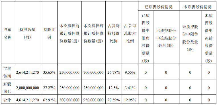 宝丰能源2025年7月6日披露的股份质押公告显示,截至公告披露日,公司控股股东宁夏宝丰集团有限公司(以下简称“宝丰集团”)持股数量为2,614,211,270股,持股比例为35.65%;累计质押公司股份700,000,000股,占其所持公司股份的26.78%,占公司总股本的9.55%。宝丰集团及其一致行动人东毅国际合计持股数量为4,614,211,270股,持股比例为62.92%;累计质押公司股份950,000,000股,占其所持股份比例的20.59%,占公司总股本比例的12.95%。
