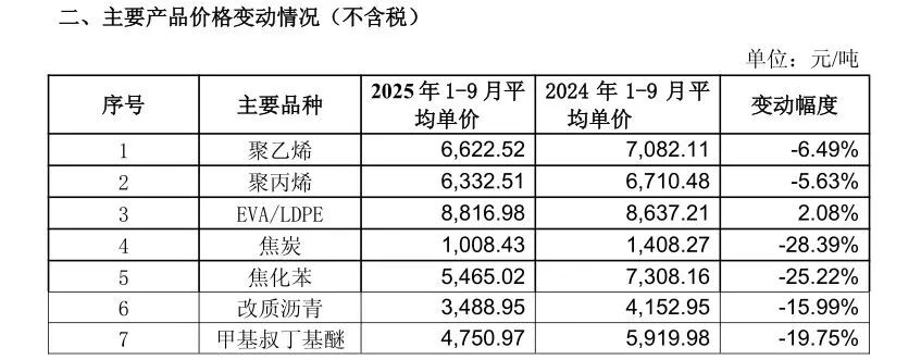 2025年前三季度营收113.04亿元的聚丙烯,价格同比下降5.63%。