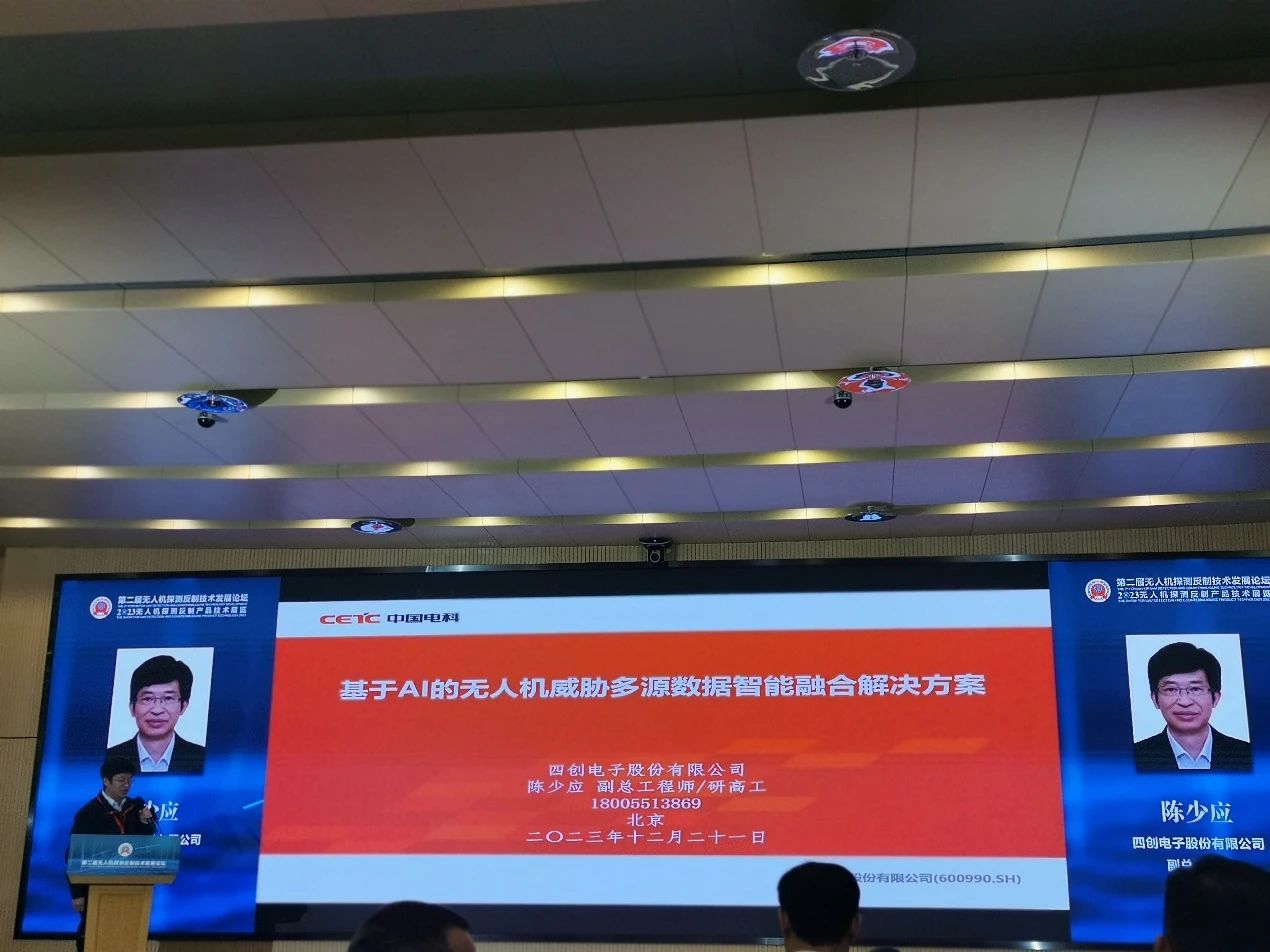 公司副总工程师陈少应在主论坛上作《基于AI的无人机威胁多源数据智能融和解决方案》的精彩报告。