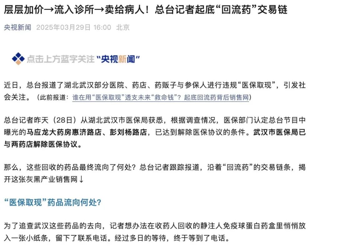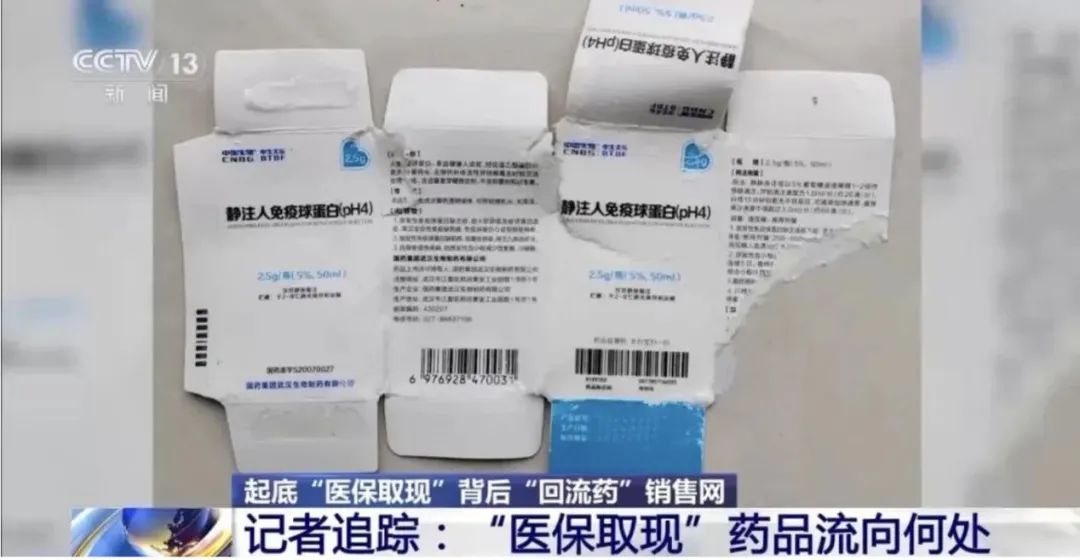 所谓“回流药”,就是那些通过非法途径,从正规医院、药店流出,又再次回到市场上的药品。今年3月,央视报道了湖北武汉部分医院、药店、药贩子与参保人进行违规“医保取现”,“回流药”的购销链条浮出水面。据报道,武汉的收药人招揽参保人到在马应龙大药房的两家门店购药“套现”,再将回收的静注人免疫球蛋白等药品,通过中间人何某转卖给新洲区的供货商罗某,罗某再转卖给新洲区的卫生院、私人诊所和药店,最后用到患者身上。