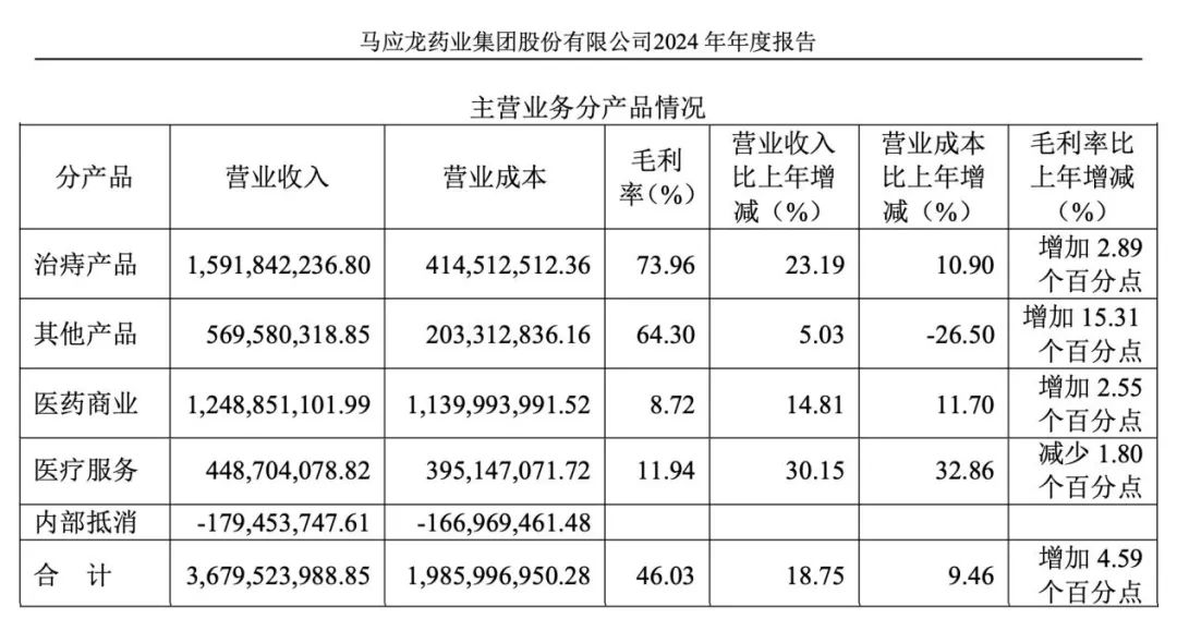 2024年,马应龙的业务以医药工业、医疗服务和医药商业三大业务线为主,三大板块的营业收入分别为21.61亿元、12.49亿元、4.49亿元,医药工业里面,治痔产品营收达15.92亿元,占到医药工业收入的73%,占公司营业总收入的超过四成,毛利率高达73.96%。