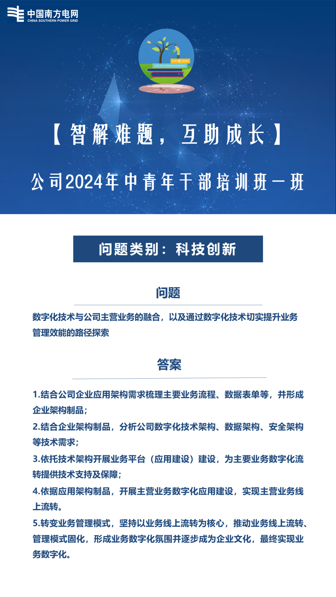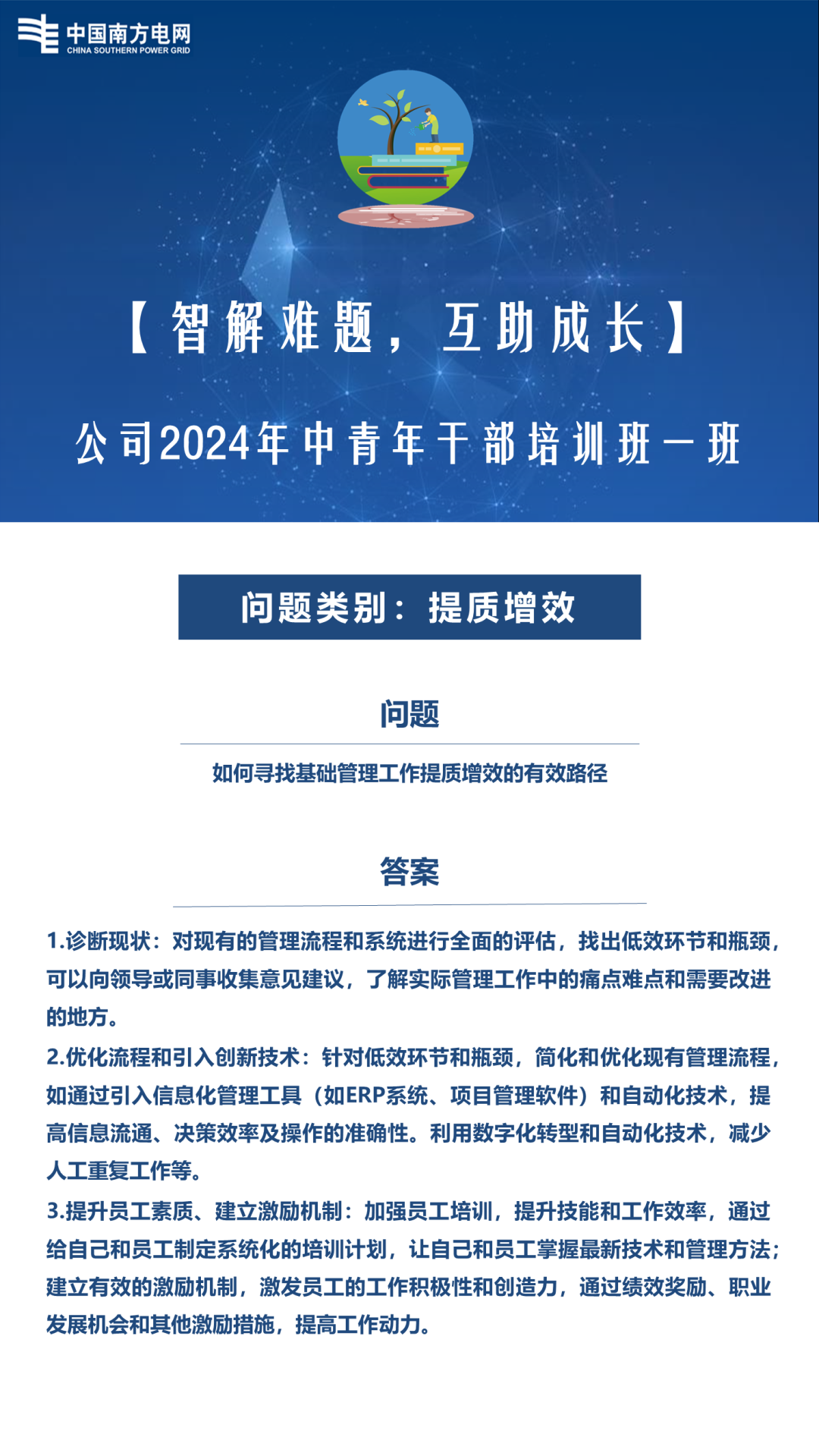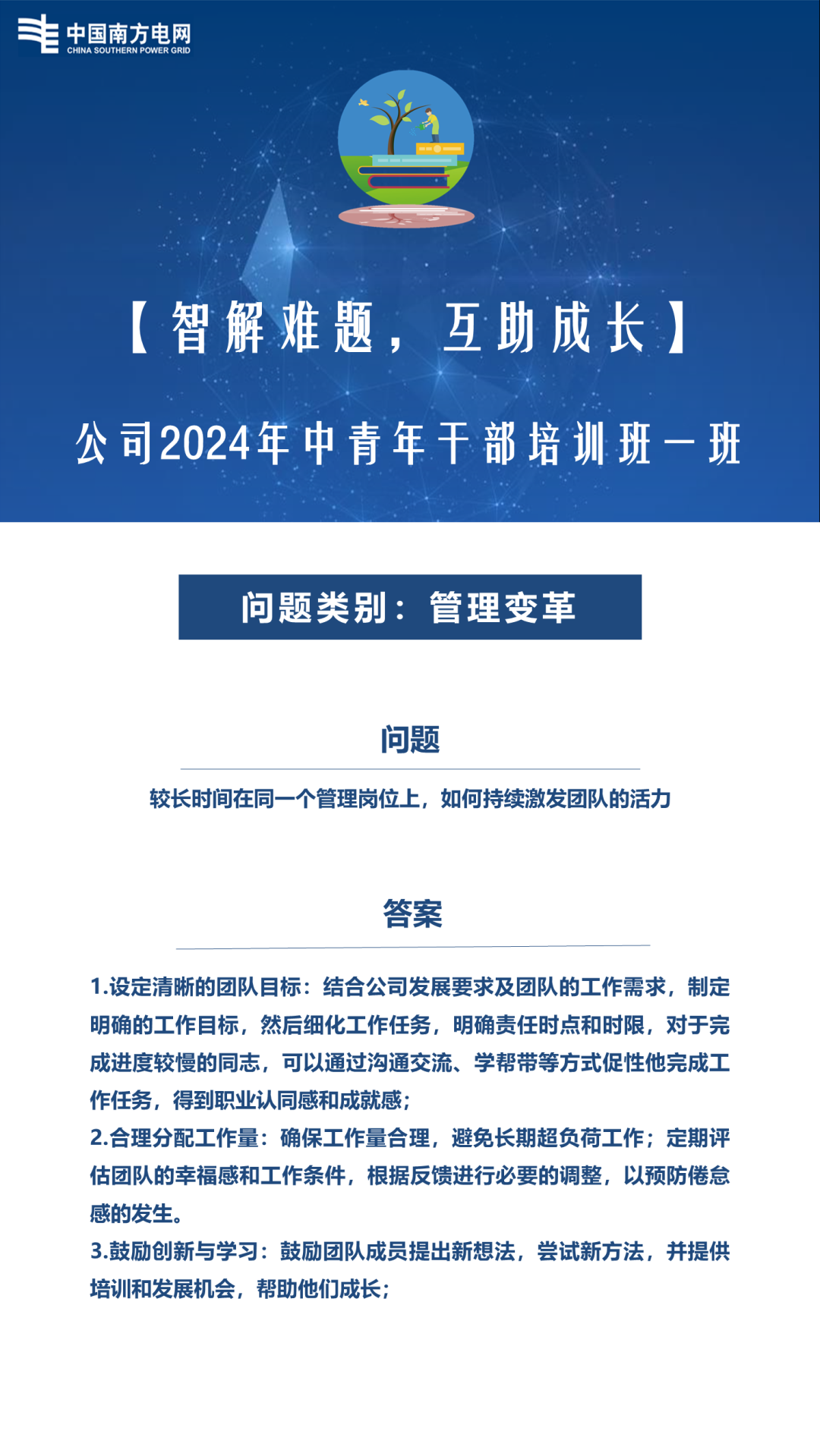 为汇聚集体智慧,解决学员面临的实际问题,培训班组织“智解难题、互助成长”活动。在培训前收集学员在工作中遇到的难题;培训期间学员每人认领一个学习问题,带着问题去学习、思考及研讨,最终对问题进行解答;培训结束后沉淀学员的答案形成管理智慧集。