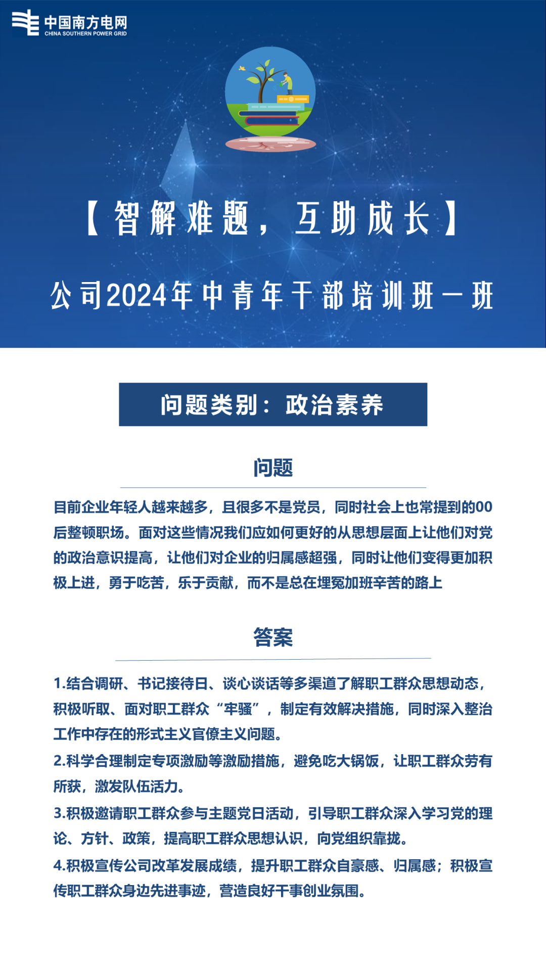 为深入贯彻落实《南方电网公司关于加强年轻干部教育管理监督的若干措施》,紧紧围绕“总书记和党中央希望年轻干部怎么样,我们就怎样去培养”,以全面提升中青年干部的理论素养和管理能力为核心目标,探索搭建支撑公司高质量发展的干部培训体系,精心培育一支既具备政治觉悟又精通管理实践的高素质干部队伍,6月17日至7月5日,南网储能公司举办2024年中青年干部培训班一班,公司系统中青年干部共35人参加培训。