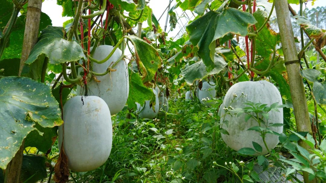 像南方20多度左右很适合我们种白皮冬瓜,每天6点钟就过来摘苗,长出来的小苗要摘掉,下午要灌溉。有人来,我们就摘出来给他们装车,1个冬瓜在25到30斤左右,冬瓜的口感很清甜,拿来煲鸭子汤,味道很好、很解暑。