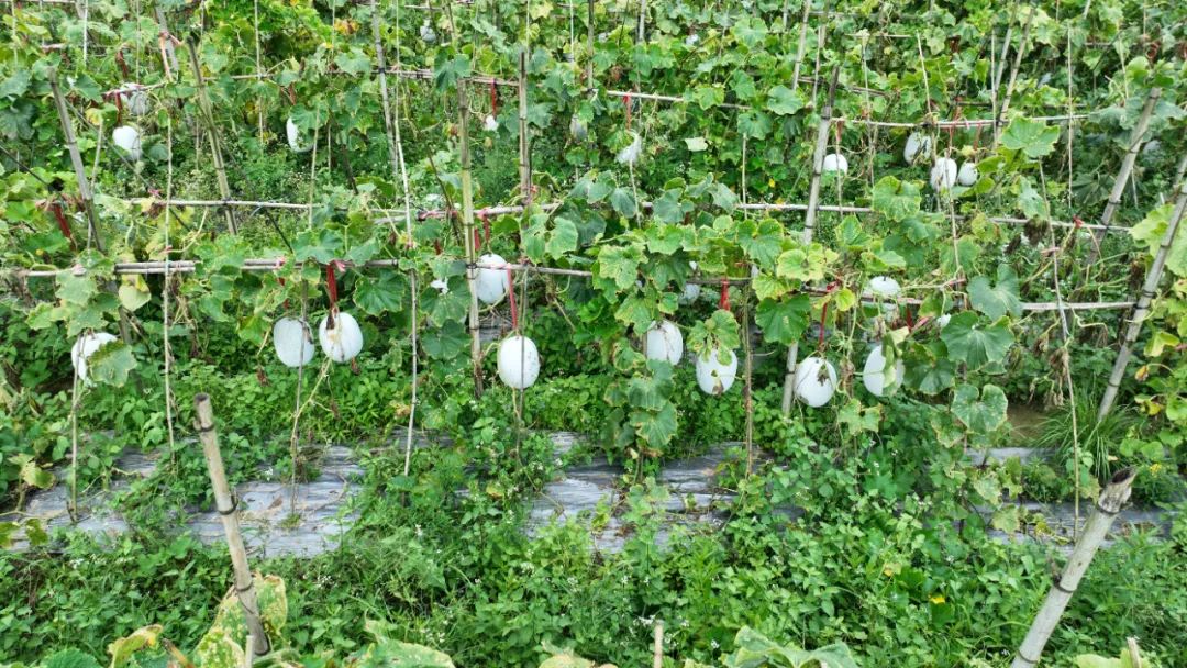 走进来石村的冬瓜田,看见一个个饱满硕大的白皮冬瓜挂在架子上,瓜皮表面还披着一层白霜,长势喜人。据了解,这批冬瓜种植面积近40亩,亩产量在1万斤左右。