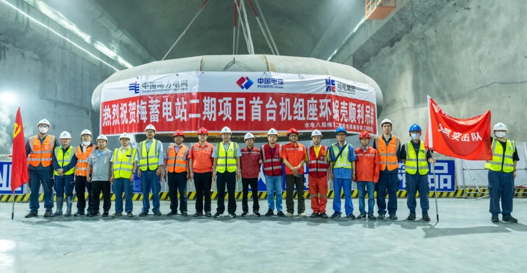 ▲梅蓄电站二期项目首台机组座环蜗壳顺利吊装