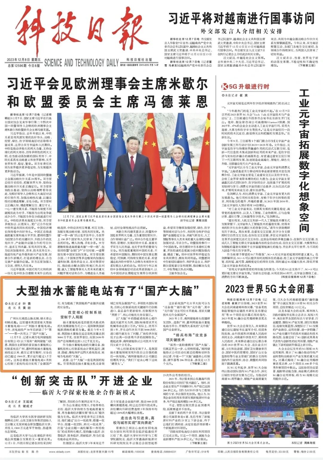 2023年12月8日,科技日报头版刊登《大型抽水蓄能电站有了“国产大脑”》成果报道