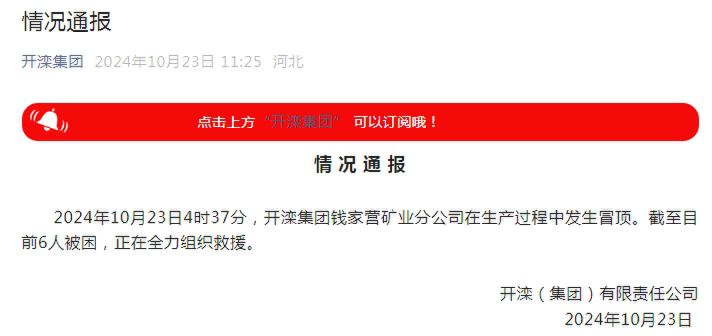 开滦集团10月23日发布情况通报,10月23日4时37分,开滦集团钱家营矿业分公司在生产过程中发生冒顶。截至目前6人被困,正在全力组织救援。