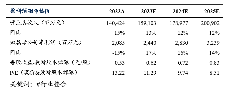 盈利预测与投资评级:维持预计公司2023-2025年归母净利润分别为24.40/28.30/32.39亿元,对应当前市值的估值为11/10/9倍,维持“买入”评级。