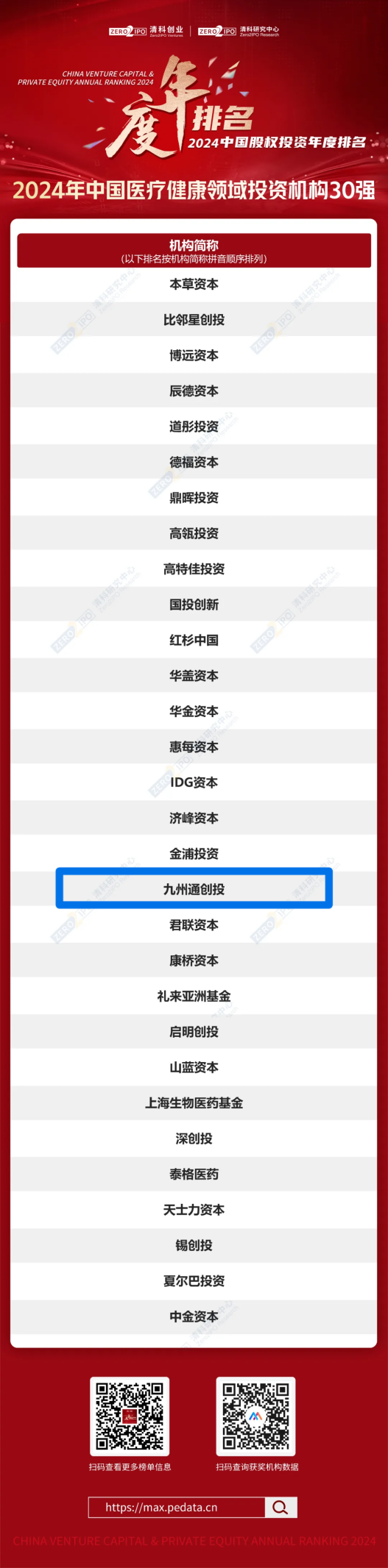 12月11日,清科创业、清科研究中心正式揭晓了“清科2024年中国股权投资年度排名”(以下简称“清科年度排名”),九州通创投凭借卓越的投资业绩,出色的投后赋能能力,雄厚的产业背景和资源优势,成功跻身清科年度排名子榜单——“2024年中国医疗健康领域投资机构30强”。一同登榜的还有高瓴投资、红杉中国、君联资本、启明创投、礼来亚洲基金、上海生物医药基金、深创投、中金资本等顶尖的股权投资机构、政府产业基金、国有综合性投资集团。
