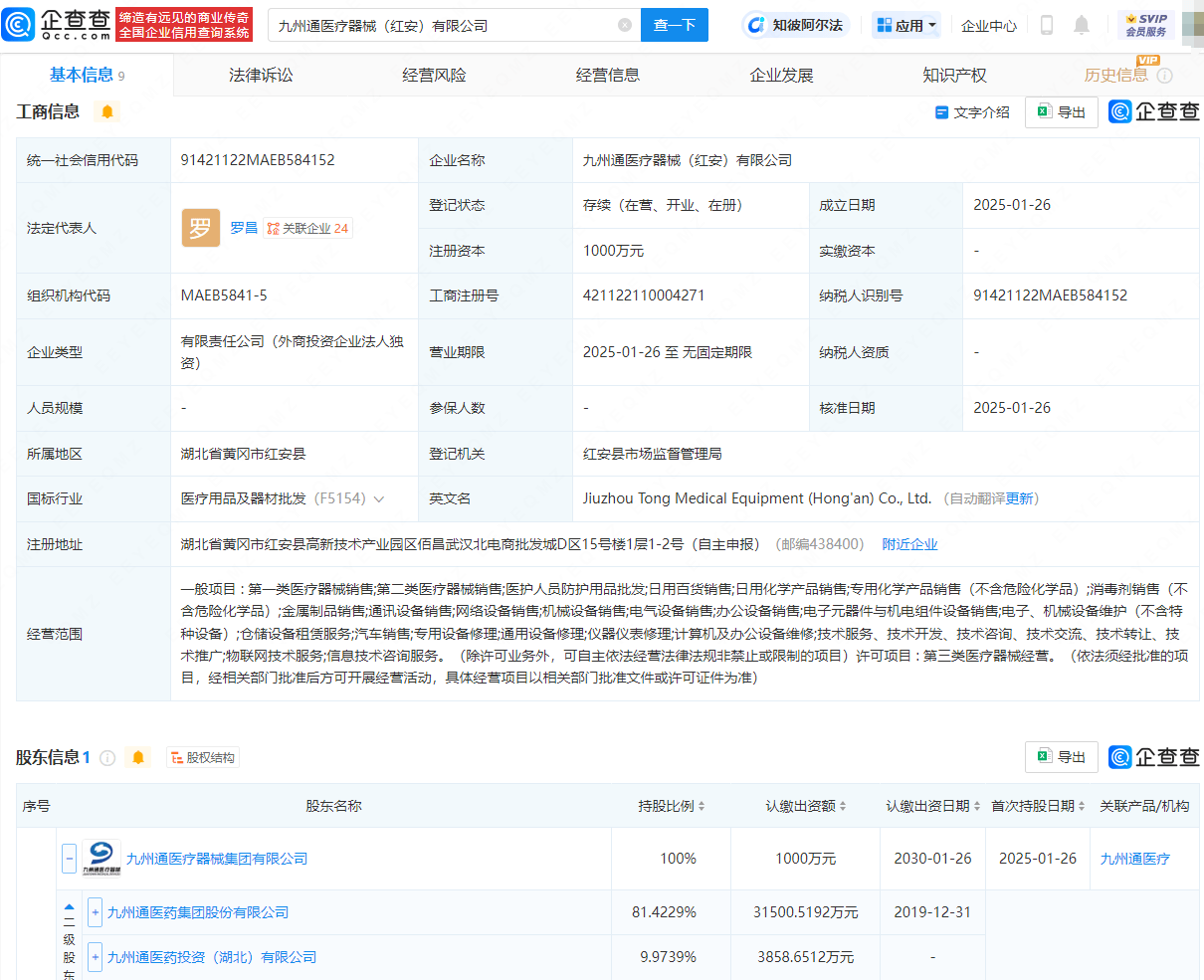 近日,九州通医疗器械(红安)有限公司成立,法定代表人为罗昌,注册资本为1000万元,经营范围包含:第一类医疗器械销售;第二类医疗器械销售;医护人员防护用品批发;日用百货销售;日用化学产品销售;通讯设备销售;汽车销售等。股权穿透显示,该公司由九州通(600998)旗下九州通医疗器械集团有限公司全资持股。