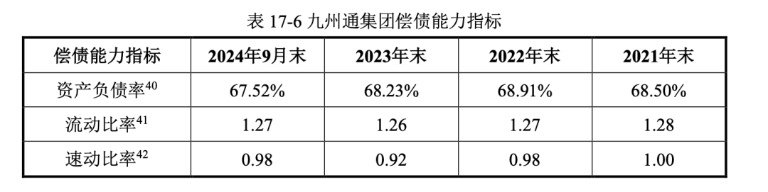2021-2023年末及2024年9月末,九州通资产负债率分别为68.50%、68.91%、68.23%和67.52%,报告期各期末,九州通资产负债率保持在较高水平。