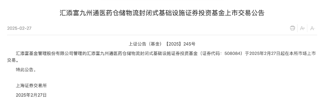2月27日,汇添富基金管理股份有限公司管理的汇添富九州通医药仓储物流封闭式基础设施证券投资基金(证券代码:508084)简称“九州通R”,正式在上交所上市交易,开盘涨幅达到30%,触及公募REITs上市首日的涨停上限。