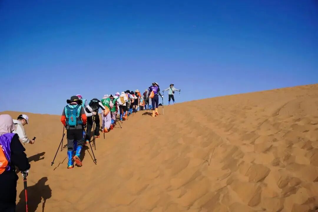 在接下来连续两日的艰苦征途中,好药师远征队队员们直面灼热烈日与漫天风沙,一步步征服起伏的沙丘。面对挑战,队员们展现了惊人的毅力与团队精神——有的主动分担队友的负重,有的不断用话语激励同伴,更有队员在体力接近极限时,在队友的搀扶下坚持向前。整个队伍无一人掉队,最终抵达终点,用行动诠释了“不抛弃、不放弃”的团队信念。