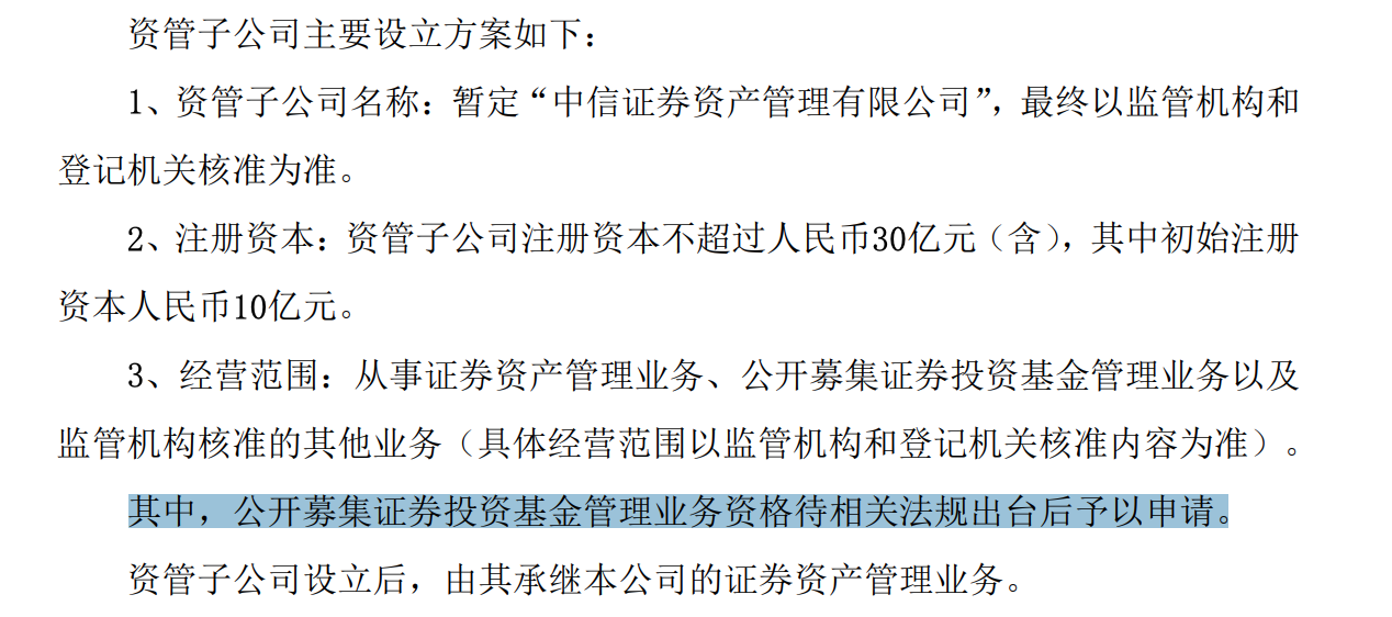 2022年12月30日,证监会核准中信证券设立中信资管,而作为券商龙头的中信证券,在此前拟设立资管子公司的公告中就表示,资管子公司落地后,将申请公募基金牌照。