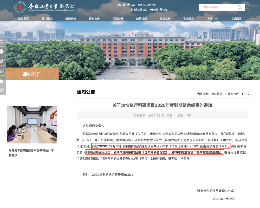 合肥工业大学20220年5月发布通知公告显示“《关于加快执行科研项目2020年度到期结余经费的通知》