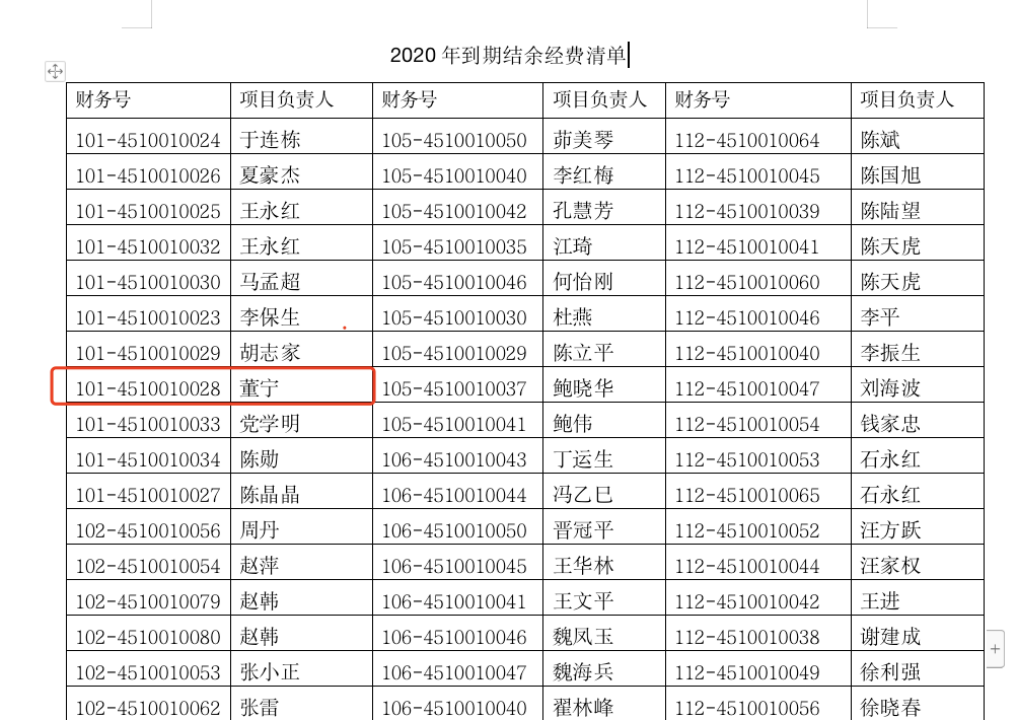 根据财政部科技部教育部发展改革委《关于进一步做好中央财政科研项目资金管理等政策贯彻落实工作的通知》(财科教〔2017〕6号)文件规定,中央财政科研项目结余资金 2年后(自验收结论下达后次年的1月1日起计算)未用完的,按规定原渠道收回。我校2020年12月30日前到期的结余经费项目共计222项(详单见附件:2020年到期结余经费清单)。请各位项目负责人加快经费使用速度,到期未使用完的经费(含未冲销暂借款),都将根据主管部门要求按原渠道退回。在使用经费过程中遇到任何困难,可联系科研经费管理办公室。财务处科研经费管理办公室2020年5月22日”