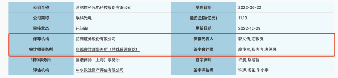 埃科光电此次保荐机构为招商证券股份有限公司(以下简称“招商证券”)保荐代表人郭文倩,江敬良。会计师事务所为容诚会计师事务所(特殊普通合伙)签字会计师廖传宝,张冉冉,唐保凤。