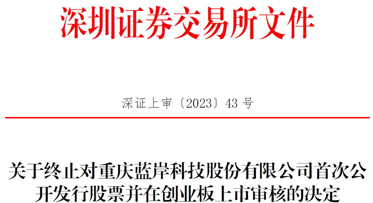 2023年2月16日,蓝岸科技向深交所提交了《重庆蓝岸科技股份有限公司关于撤回首次公开发行股票并在创业板上市申请文件的申请》,保荐人向深交所提交了《招商证券股份有限公司关于撤回重庆蓝岸科技股份有限公司首次公开发行股票并在创业板上市申请文件的申请》。根据《深圳证券交易所股票发行上市审核规则》第六十二条的有关规定,深交所决定终止对蓝岸科技首次公开发行股票并在创业板上市的审核。