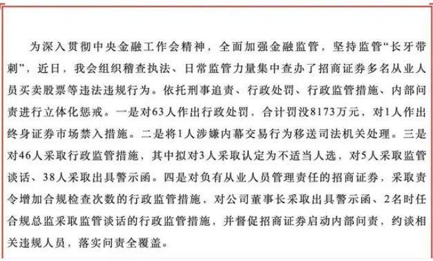 据“证监会发布”信息,招商证券多名从业人员买卖股票等违法违规行为,共对63人作出行政处罚,合计罚没高达8173万元。