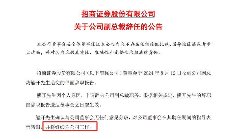 今日,招商证券公告称,公司董事会于2024年8月12日收到公司副总裁熊开递交的书面辞职报告。熊开因个人原因,申请辞去公司副总裁职务。根据相关规定,熊开的辞职自辞职报告送达董事会之日起生效。
