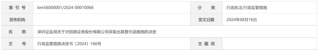 8月16日,深圳证监局公布对招商证券采取出具警示函措施的决定。招商证券在从事投资银行类业务过程中,部分投行项目持续督导工作存在督导上市公司规范运作力度不足,对于其他证券服务机构专业意见的审慎运用及独立核查不够,底稿不完善等问题。