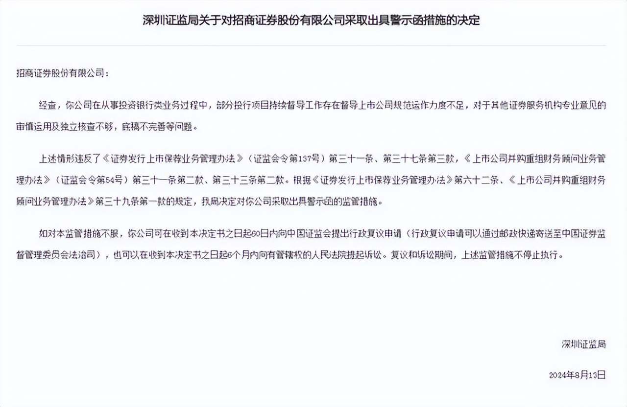 就在8月16日,深圳证监局官网披露,因招商证券投资银行业务违规,深圳证监局决定对其出具警示函。罚单指出,招商证券在从事投资银行类业务过程中,部分投行项目持续督导工作存在督导上市公司规范运作力度不足,对于其他证券服务机构专业意见的审慎运用及独立核查不够,底稿不完善等问题。因上述问题违反相关规定,深圳证监局决定对招商证券采取出具警示函的措施。