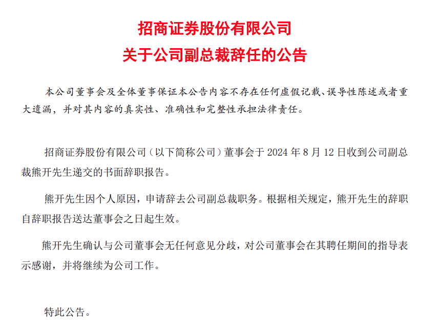 就在收到上述警示函的前几日,即8月12日,招商证券发布公告表示,公司副总裁熊开因个人原因申请辞去副总裁职务。值得注意的是,招商证券于去年8月30日才聘任熊开为副总裁。