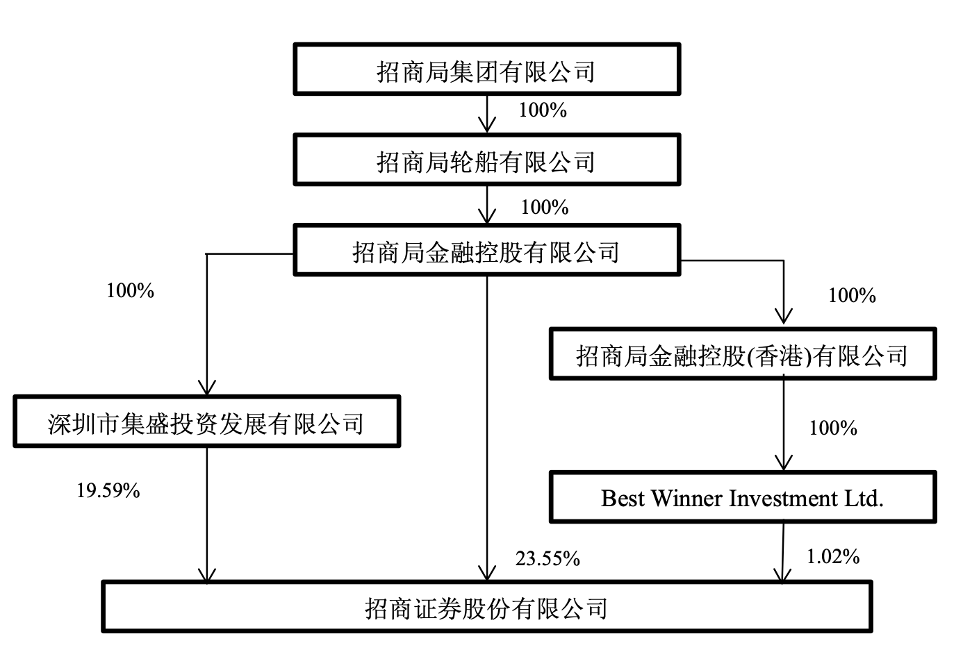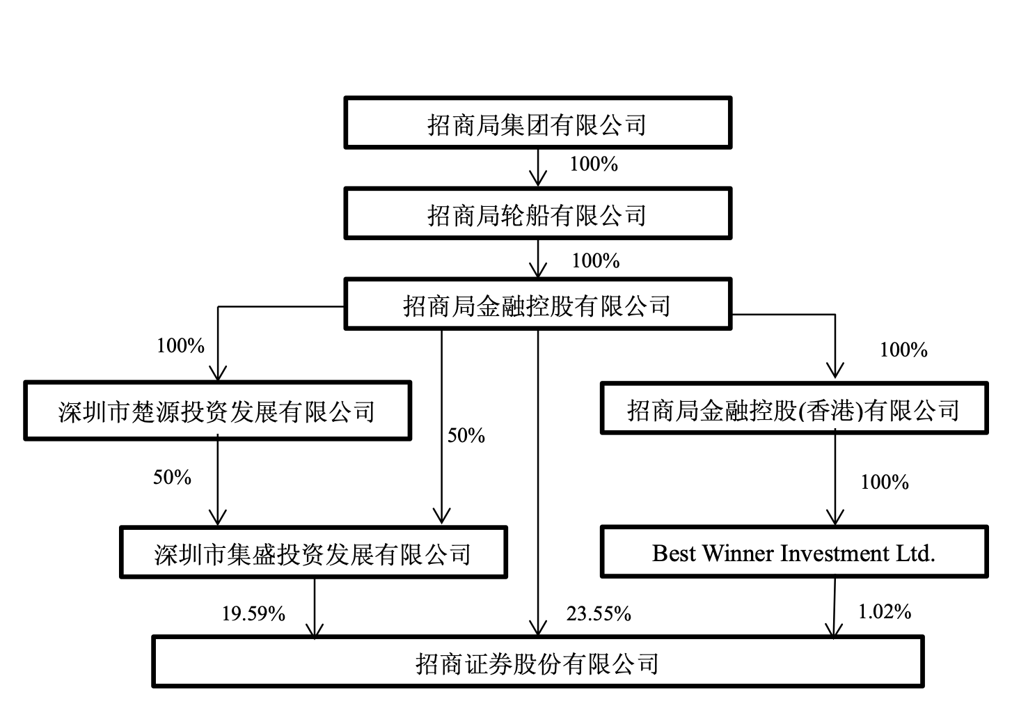 公告显示,9月10日,招商金控与楚源投资签署无偿划转协议,楚源投资将其持有的集盛投资50%股权无偿划转至招商金控。划转前,招商金控持有楚源投资100%股权,并直接持有集盛投资50%股权,而楚源投资则持有集盛投资剩余50%股权。这意味着,招商金控通过两层间接持股,实现了对集盛投资的控制。而集盛投资持有招商证券1,703,934,870股A股股票,占总股本的19.59%。